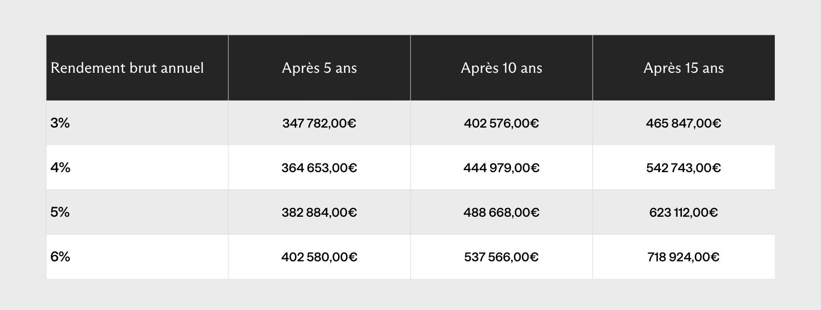 Selon le rendement (3–6 % brut), le capital peut évoluer entre 402 000€ et 537 000€ hors fiscalité.